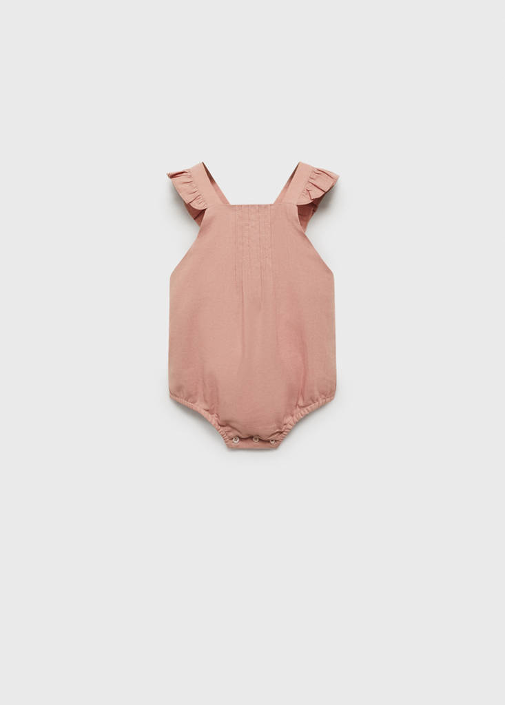 Cotton fabric. Linen fabric. Square Neckline. Ruffled straps. Pleats detail. Elastic waistband. Hem with elastic band. Hem slit with button closure