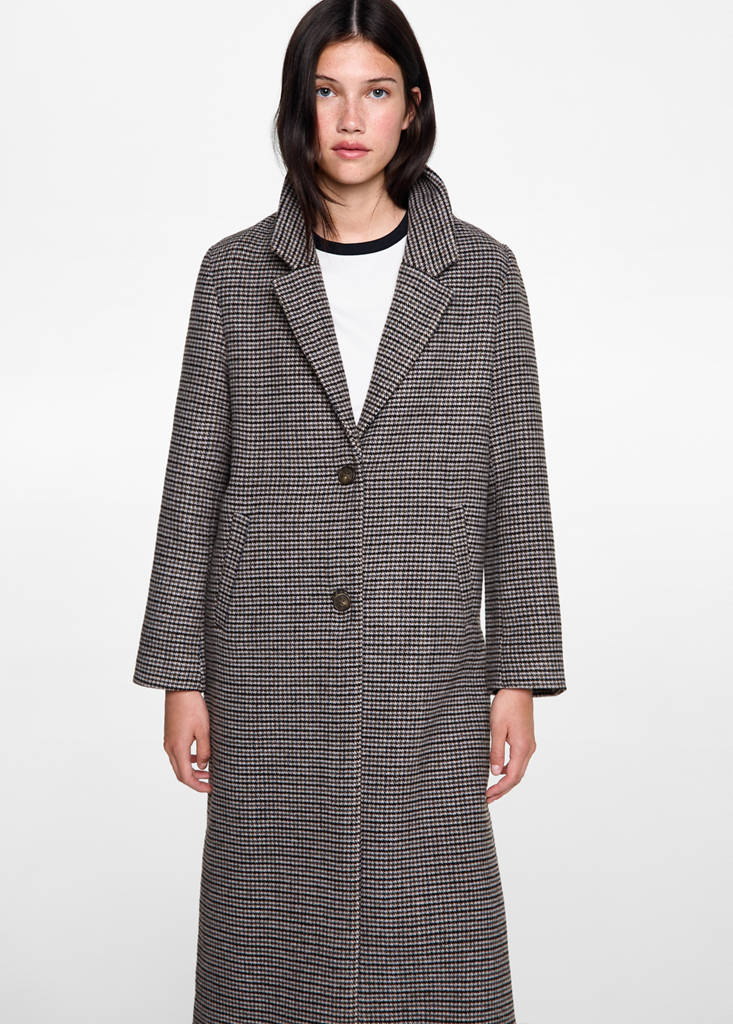 Straight design. Long sleeves. Shirt collar. Two side pockets. Front button closure. Back to class. Woven with wool. Houndstooth design