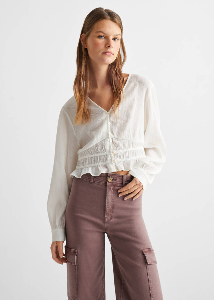 Cotton fabric. Culotte design. Straight design. Long design. Mid-rise. Two cargo pockets. Zip and button closure