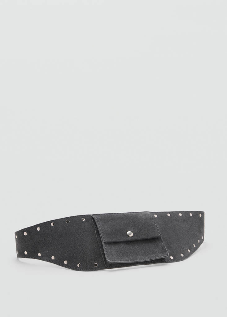 100% Leather. Wide design. Decorative studs. Mini pocket with snap button closure. Buckle closure