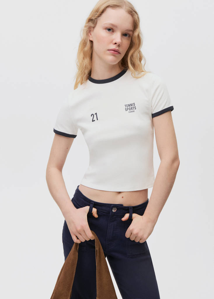 100% cotton fabric. Crop design. Round neck. Contrast collar. Contrasting cuffs. Short sleeves. Message printed on the front