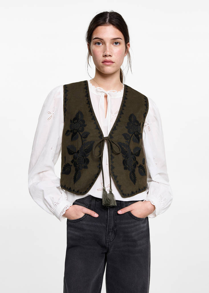 100% Cotton. Straight design. Floral embroidery. V-neck. Sleeveless. Inner lining. Tie closure