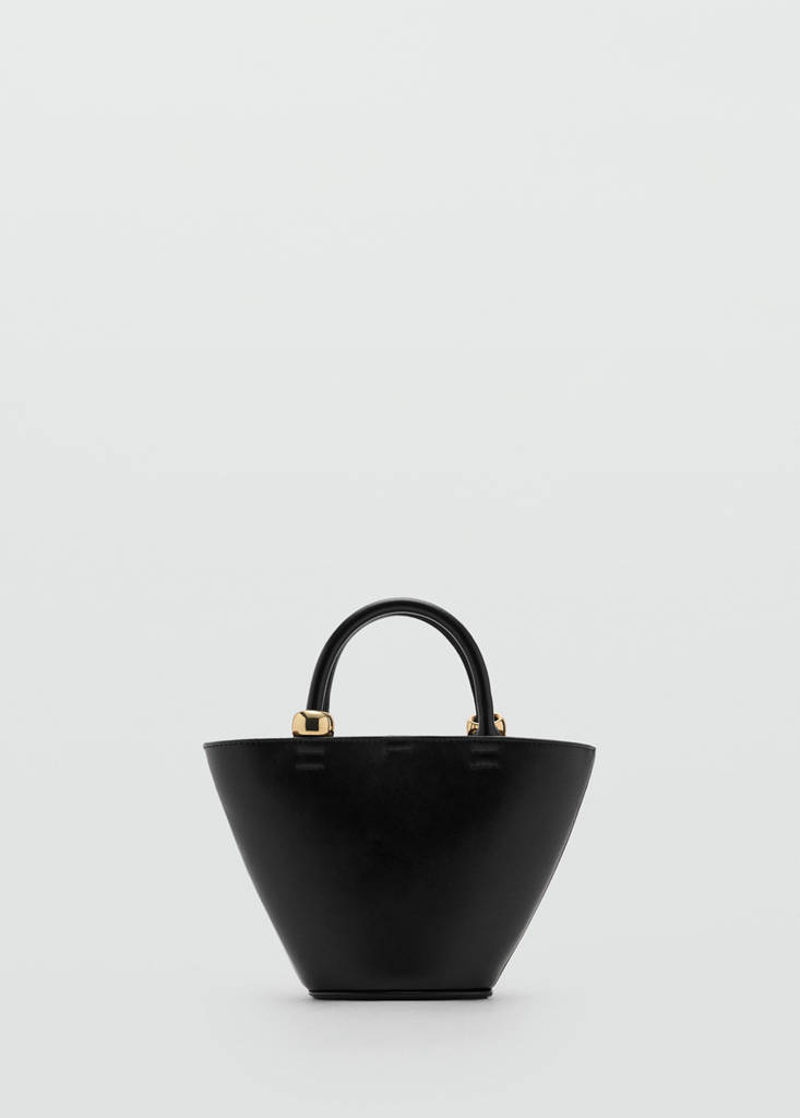 Small size. Leather effect. Detachable long crossbody strap. Top handle. Hidden carabiner closure. Metal ring detail. Inner lining