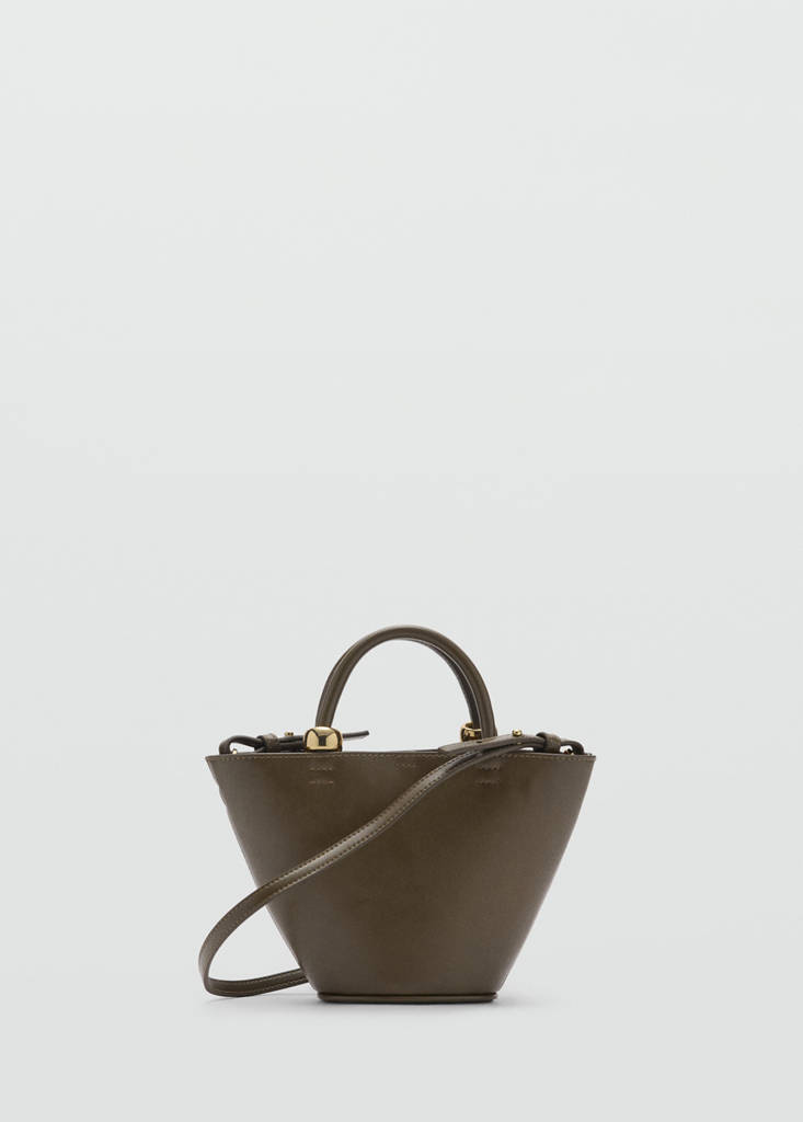 Small size. Leather effect. Detachable long crossbody strap. Top handle. Hidden carabiner closure. Metal ring detail. Inner lining