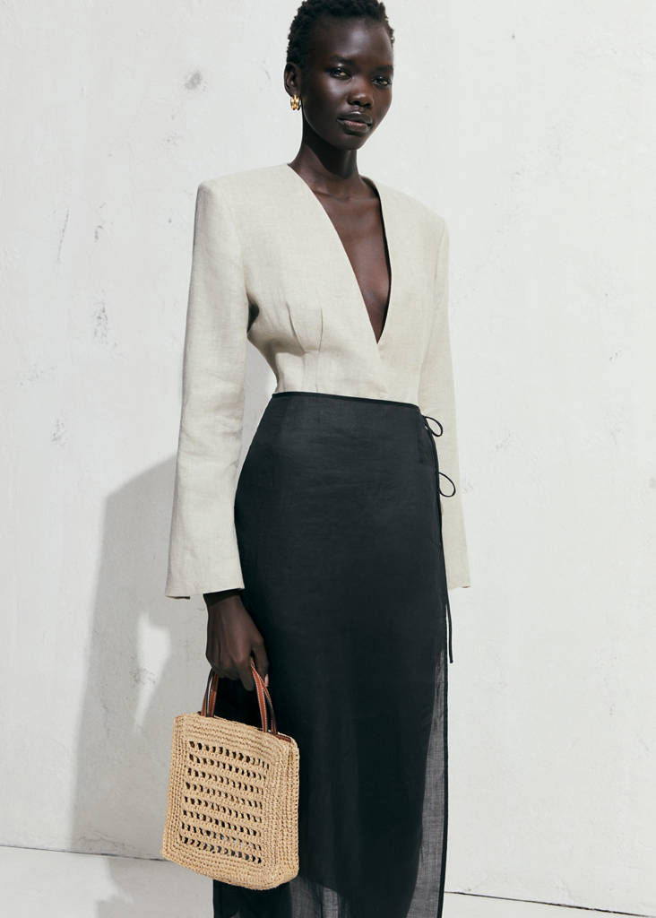Natural fiber fabric. Small size. Shopper style. Contrast detail. Double handle. Long removable strap. Metal snap closure