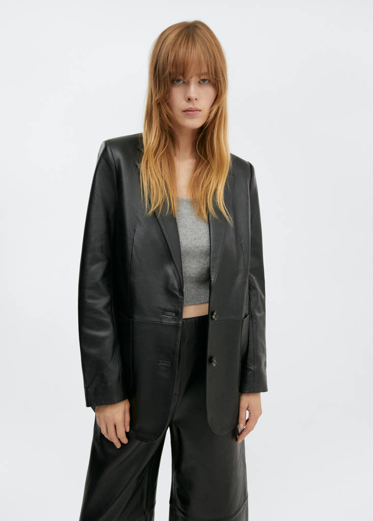 100% bovine leather. Straight design. Lapel-collar V-neck collar. Notched lapel collar. Two patch pockets on the front. Two-button closure at the front. Decorative seams. Inner lining. Total look. Office looks. Selection Collection. Long buttoned sleeves