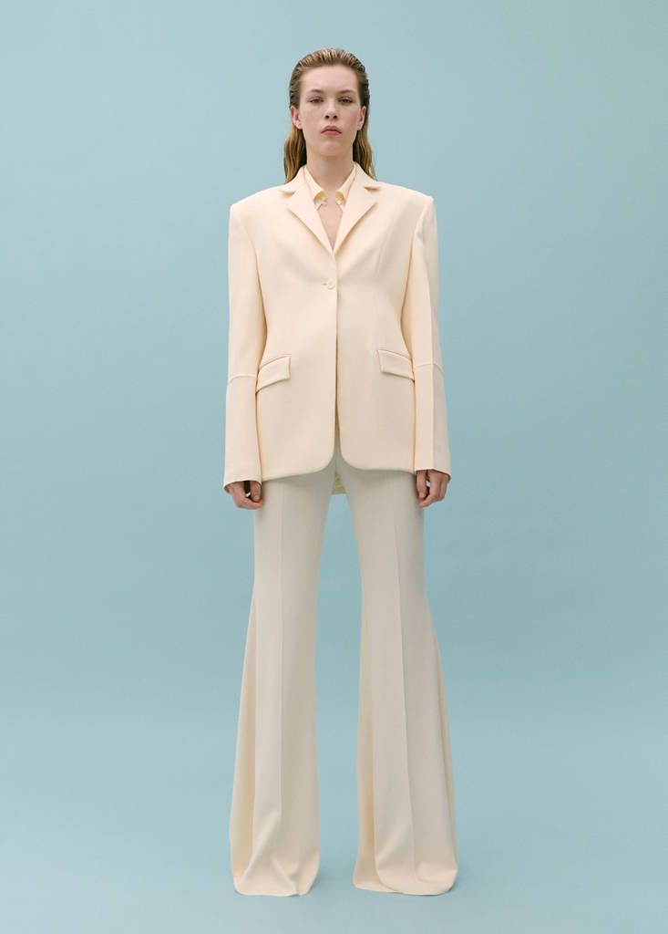 Fluid fabric. Lapel-collar V-neck collar. Notched lapels. Long sleeves. Shoulder pad. Two flap pockets on the front. Front button closure. Stitching detail. Inner lining. Total look. Fitted design