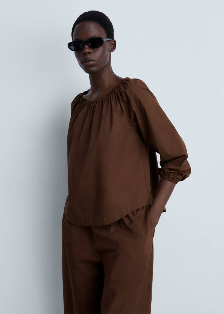 100% cotton fabric. Straight design. Ruched neck. Off-Shoulder. Long sleeves with ribbed trims. No closure. Total look