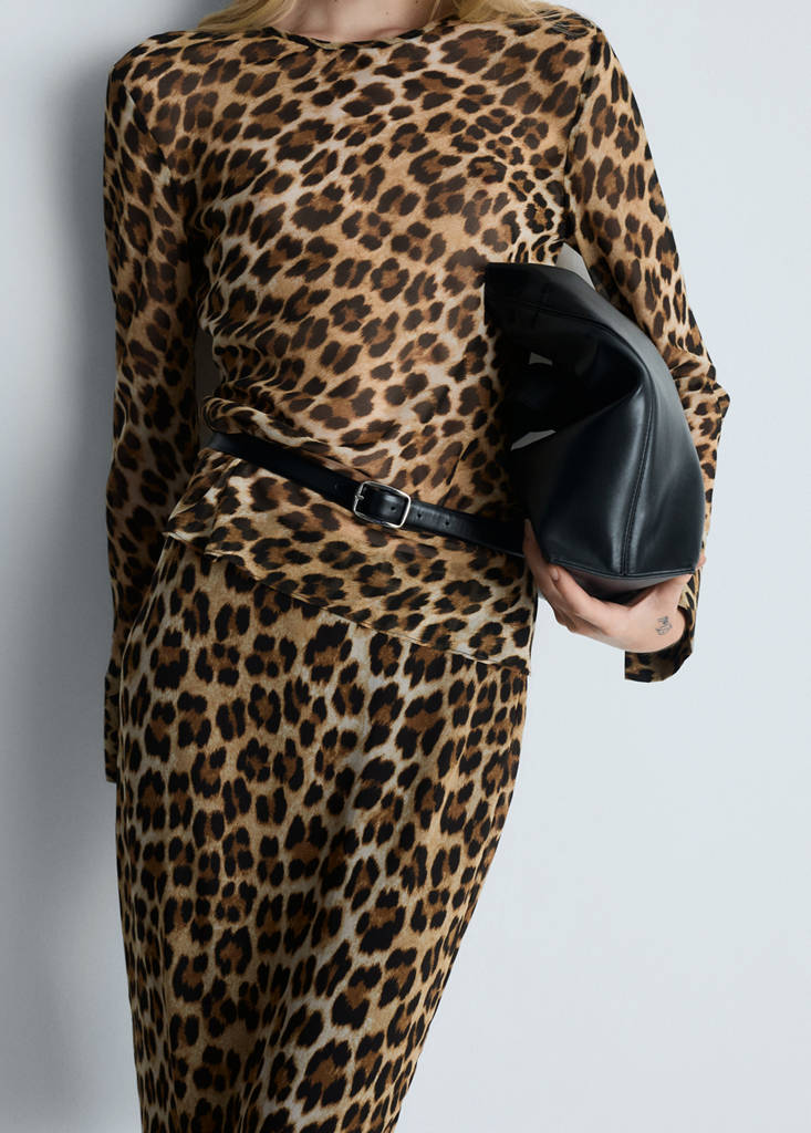 Fluid fabric. Straight design. Fitted design. Leopard print. Animal print. Round neck. Long sleeves. Button closure at the back. Total look. Lightweight fabric. Back closure. Standard design