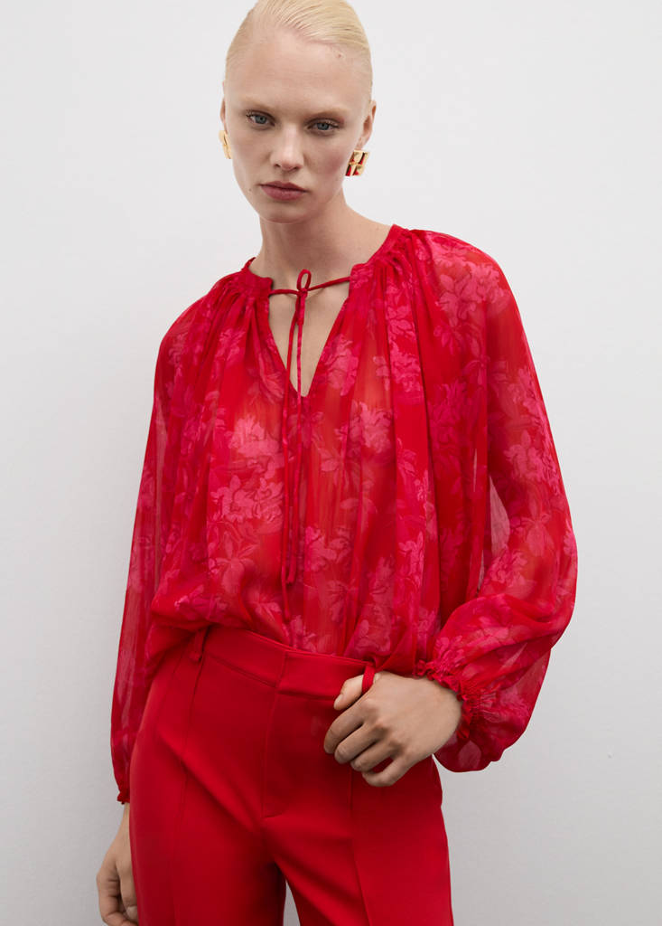 Fluid fabric. Semi-transparent fabric. Straight design. Floral print. Round neck. Long sleeves with elastic cuffs. Bow fastening on the neck. Available Plus