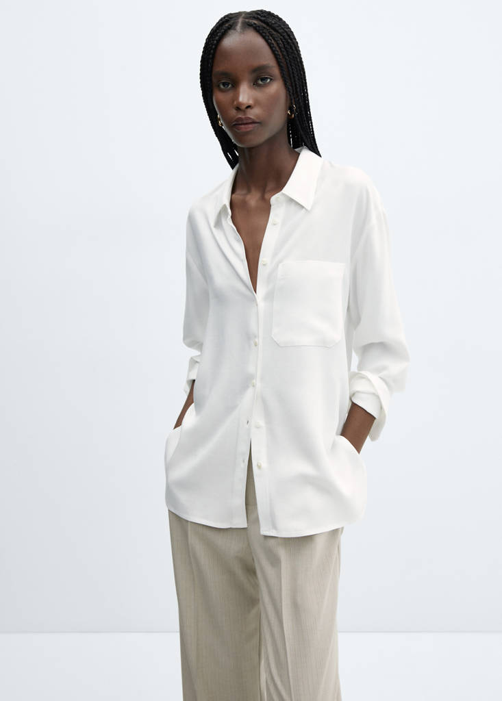 Fluid fabric. Straight design. Shirt collar. Long sleeves with buttoned cuffs. Patch pocket on the chest. Side slits. Available Plus. Front button closure. Lightweight fabric. Front closure. Long sleeves. Standard design. Regular fit