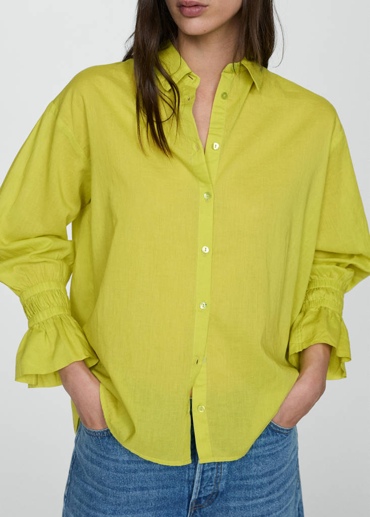 Ruched sleeve shirtInitial price struck through [US$ 59.99 ]US$ 59.99Current price [US$ 41.99 ]US$ 41.99-30%Select a colourLimeThe model is wearing size 4 (EUR S) and is 5'10" tall.Select your size0 (EUR XXS)Not available. I want it!2 (EUR XS)Not available. I want it!4 (EUR S)Not available. I want it!6 (EUR M)Not available. I want it!8 (EUR L)Not available. I want it!10 (EUR XL)Not available. I want it!12 (EUR XXL)Not available. I want it!DimensionsNotify meLong design. Straight design. Shirt collar. Long sleeves. Available in plain and patterned. Ruched detail on the cuffs. Front button closure. 100% cotton fabricDetails, composition and careStore availability