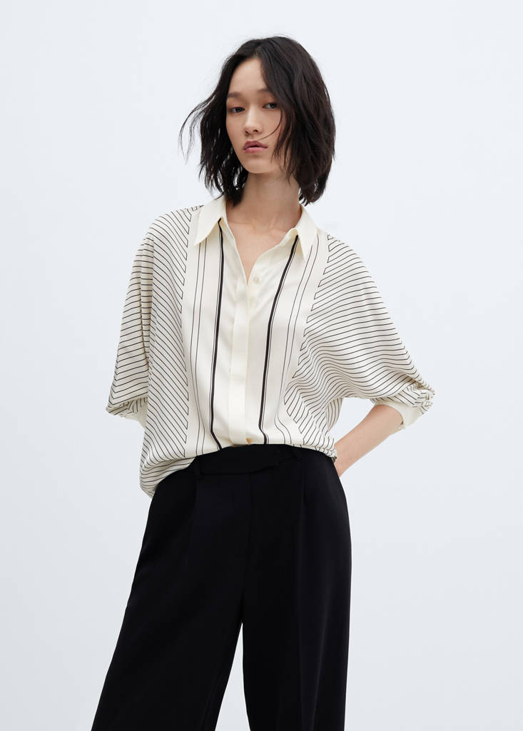 Satin weave. Fluid fabric. Oversize design. Two-tone design. Geometric print. Shirt collar. Button closure at the front. Available Plus. Office looks. Long buttoned sleeves