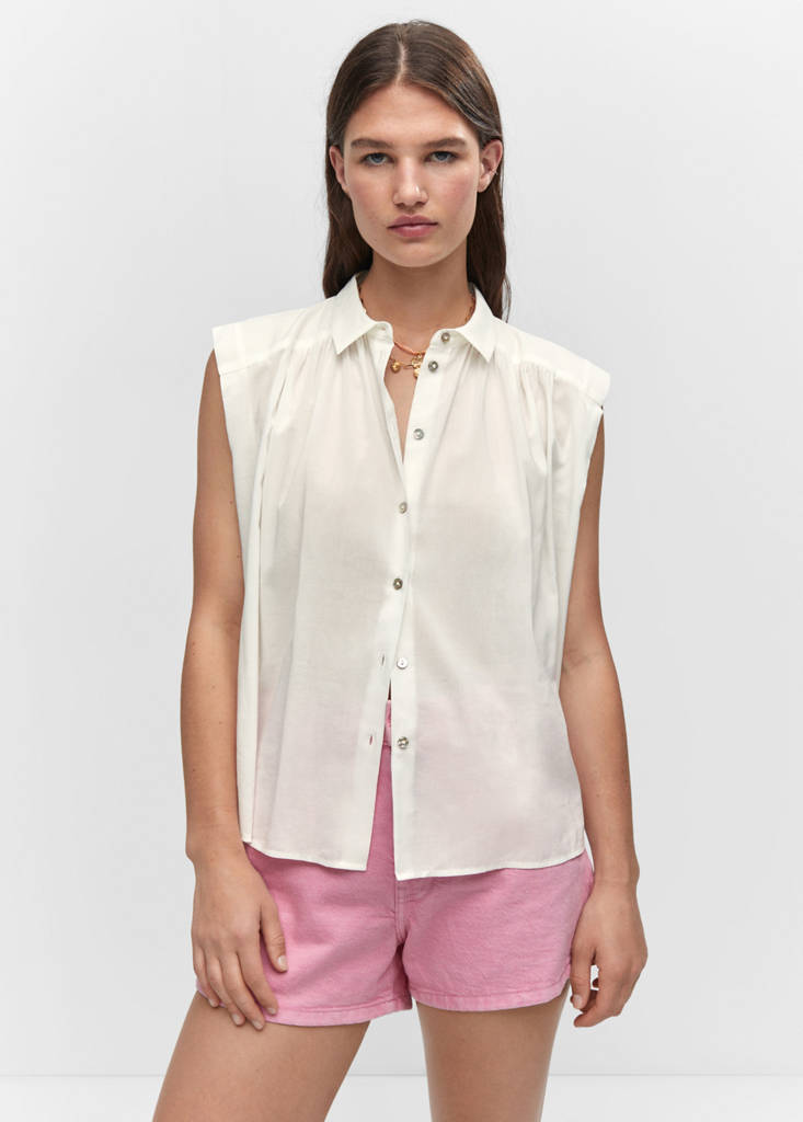 Sleeveless button-down shirtInitial price struck through [US$ 59.99 ]US$ 59.99Current price [US$ 41.99 ]US$ 41.99-30%Select a colourOff WhiteThe model is wearing size 4 (EUR S) and is 5'8" tall.Select your size0 (EUR XXS)Not available. I want it!2 (EUR XS)Not available. I want it!4 (EUR S)Not available. I want it!6 (EUR M)Not available. I want it!8 (EUR L)Not available. I want it!10 (EUR XL)Not available. I want it!12 (EUR XXL)Not available. I want it!DimensionsNotify meCotton blend fabric. Straight design. Shirt collar. Sleeveless. Ruched details. Button closure at the frontDetails, composition and careStore availability