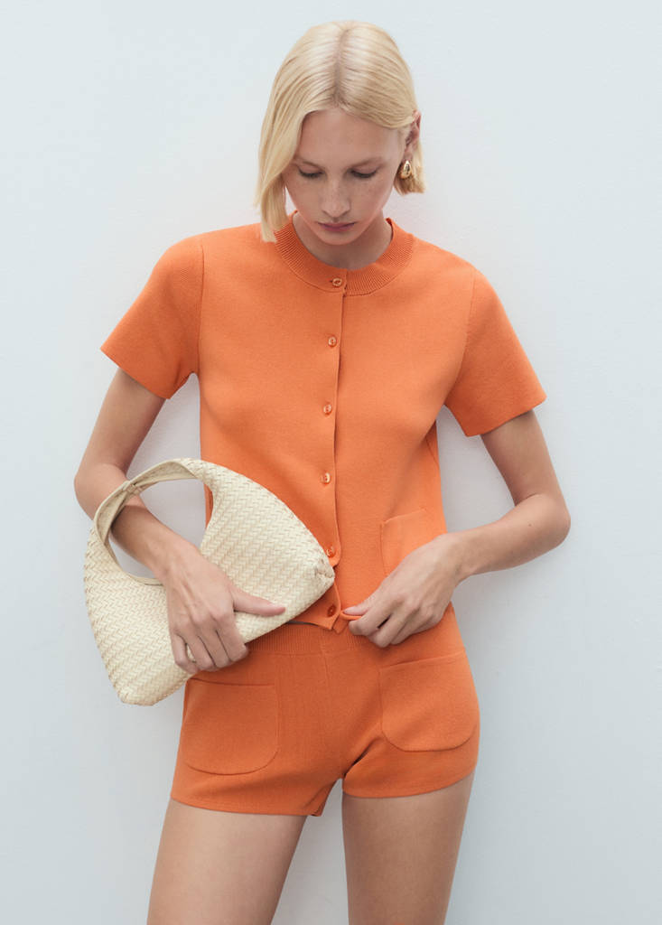 Fine knit fabric. Straight design. Round neck. Short sleeves. Two front pockets. Front button closure. Total look
