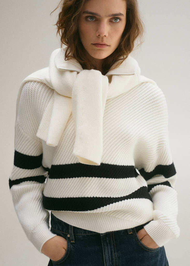 Chunky knit fabric. Straight design. Standard design. Striped print. High-neck zipper. Long sleeves. Size: 28.5x8x2 cm