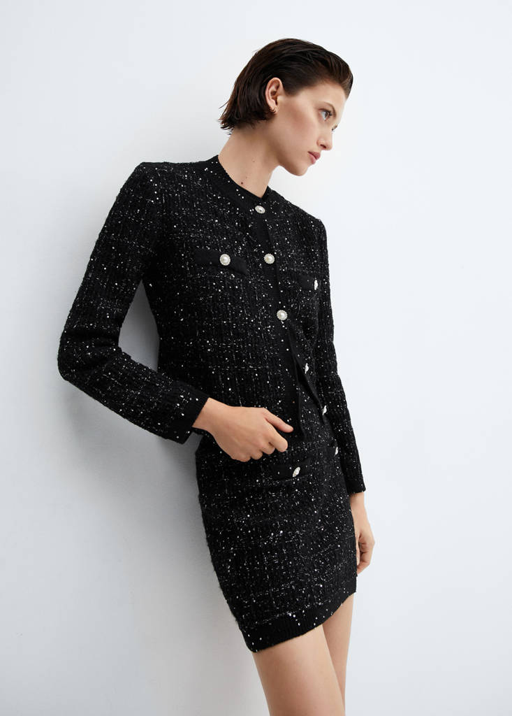 Recycled cotton-blend fabric. Tweed fabric. Midpoint. Straight design. Round neck. Long sleeves. Chest welt pocket. Jewel-effect buttons. Sequin detail. Available Plus. Total look. Front button closure