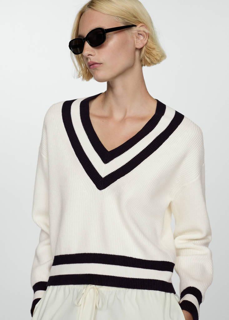 Fine knit fabric. Straight design. V-neck. Long sleeves. No closure. Contrasting finishes