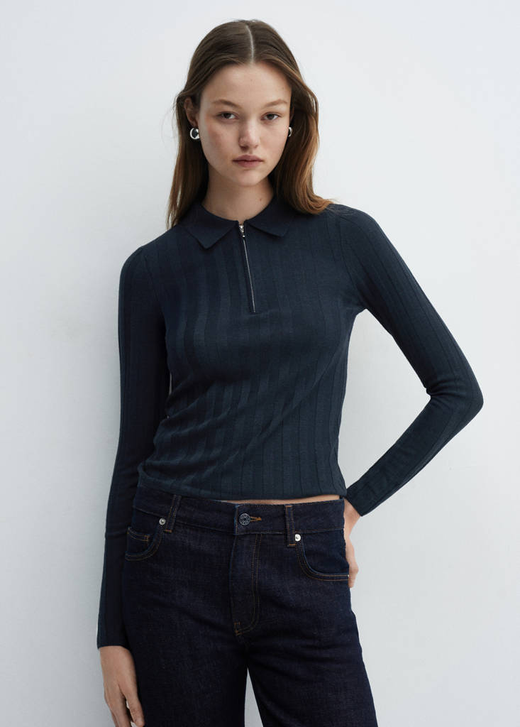 Fine knit fabric. Cable knit. Straight design. Polo-neck with zipper closure. Long sleeves. Office looks