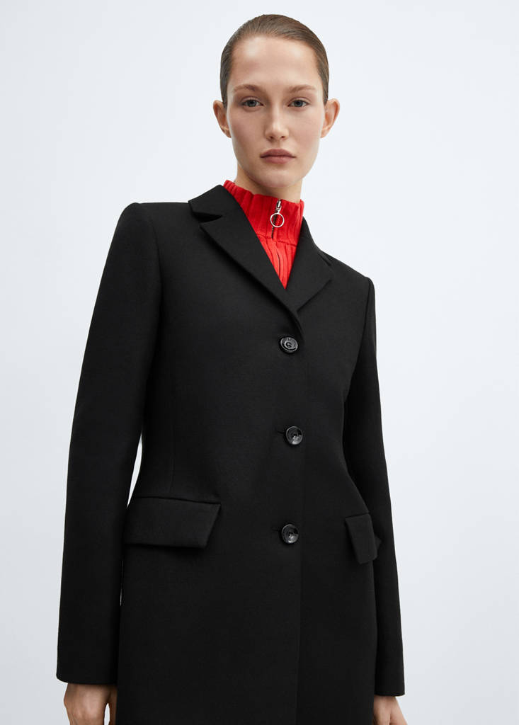Cotton blend fabric. Midi design. Straight design. Lapel-collar V-neck collar. Notched lapels. Long sleeves. Two front welt and flap pockets. Decorative seams. Inner lining. Front button closure