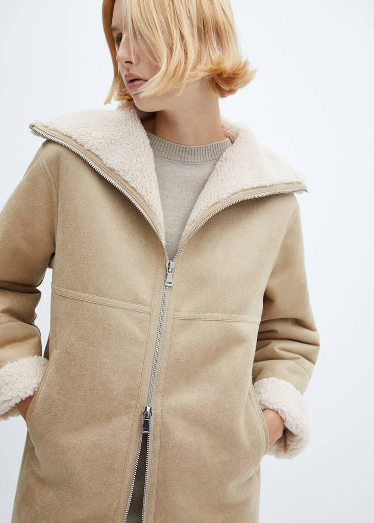 Leather effect. Oversize design. Straight design. High neck. Faux shearling collar. Long sleeves. Zip fastening on the front section. Two side pockets. Faux shearling interior. Available Plus. Double-sided design