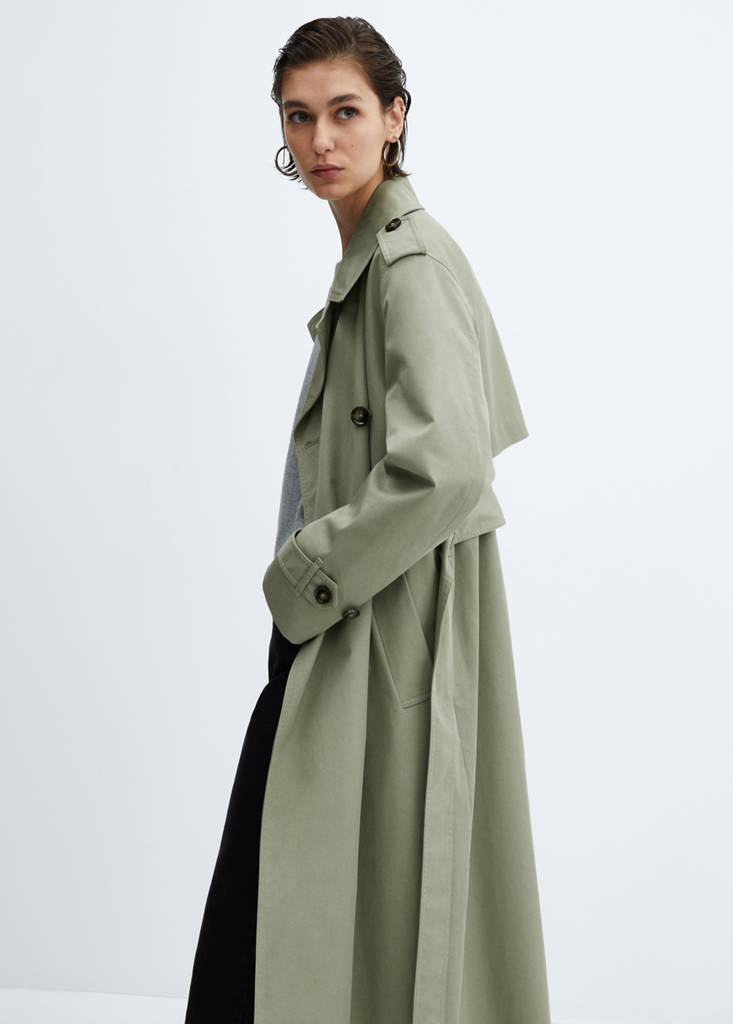 Heavy structure. Lining only. Front closure. Crossed design. Straight design. Long design. Long sleeves with buttoned cuffs. Belt loops. Removable belt. Side pockets. Button closure at the front. Mother pearl effect buttons. Inner lining. Available Plus. Office looks. Lapels. Water-repellent: The durable finish of this garment protects against light rain, repelling contact with water and raindrops. Cotton blend fabric. Midi design. Notched lapel collar