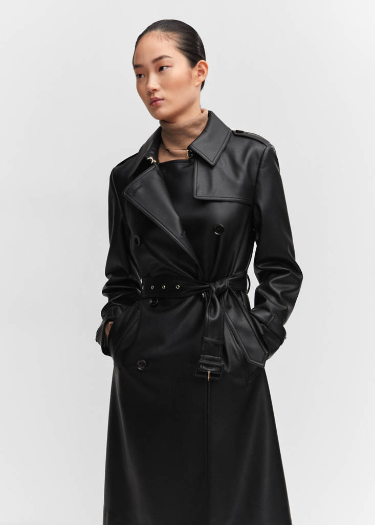 Leather effect. Straight design. Crossed design. Medium design. Notched lapel collar. Long sleeves. Loops on the cuffs. Two side pockets. Adjustable belt. Back vent at the hem. Button closure at the front. Tortoiseshell effect buttons. Inner lining. Office looks