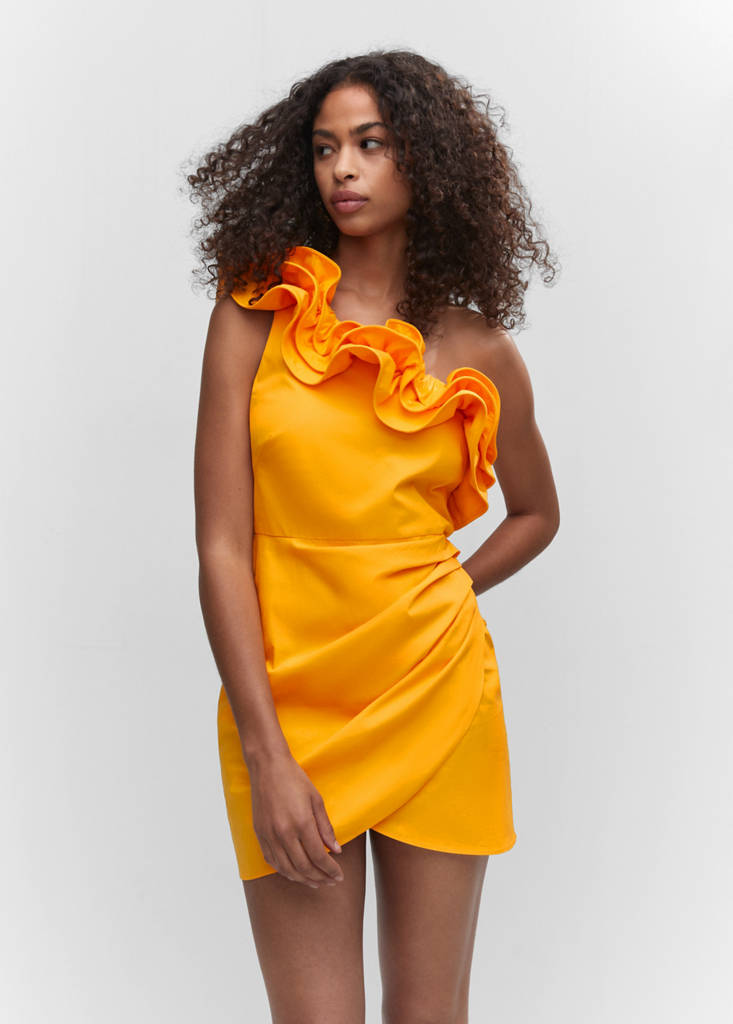 Cotton-blend fabric. Crossover design. Fitted design. Short design. Asymmetrical neckline. Ruffles detail. Sleeveless. Side zip fastening. Party and events collection