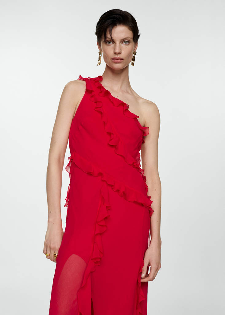 Fluid fabric. Straight design. Long design. Asymmetric design. Off-shoulder design. Asymmetric neckline. Sleeveless. Wide strap. Invisible lateral zipper fastening. Inner lining. Ruffle detail. Party, ceremony, and communion collection. This garment is part of our event collection, designed to make you the perfect guest at any party, wedding, or ceremony.