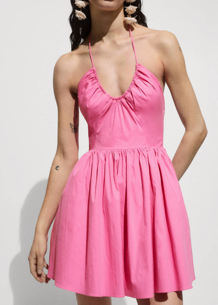 A-line design. Short design. Ruched neck. Thin straps. Open back. Elastic ruching. Side zip fastening. 100% cotton fabric