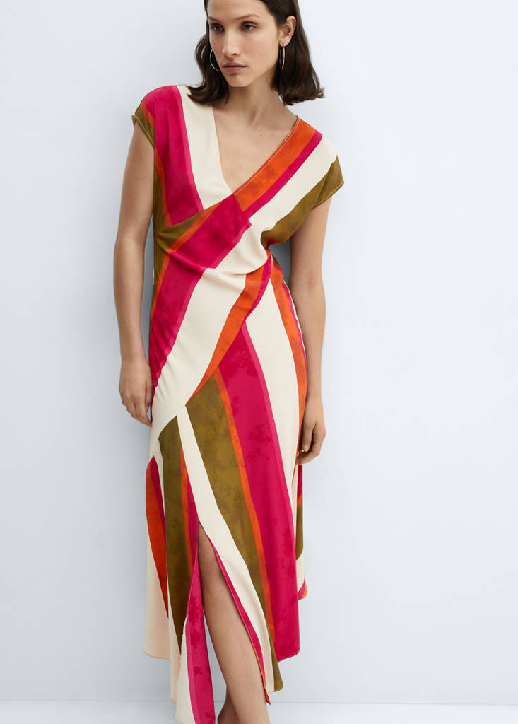 Fluid fabric. Midi design. Long design. A-line design. Striped print. V-neckline. Short sleeves. Invisible back zip fastening. Side slit. Asymmetric hem. Fitted design