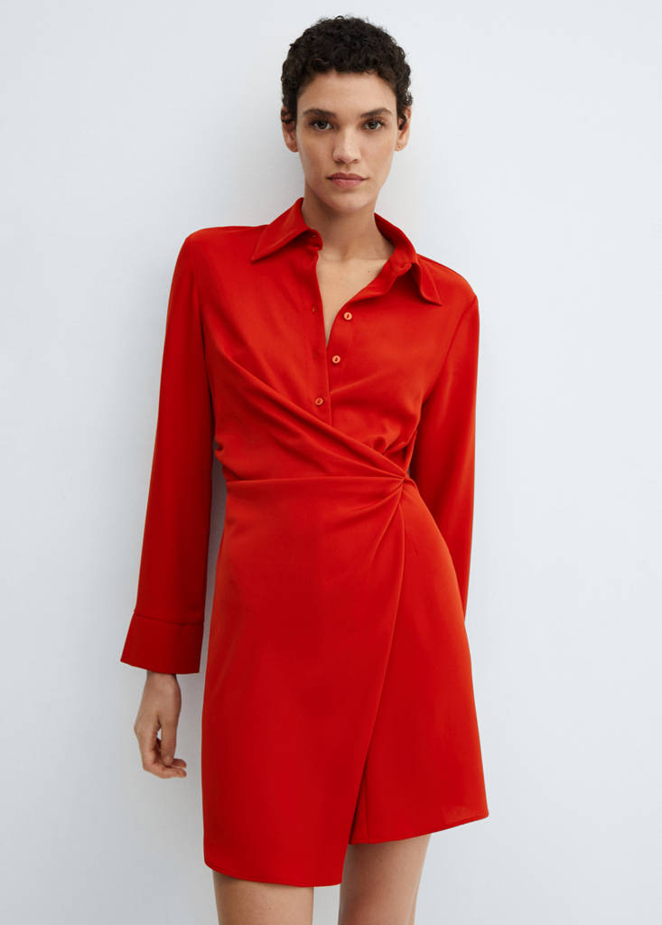 Fluid fabric. Short design. Crossed design. Shirt collar. Long sleeves with slit at cuffs. Elastic back. Draped detail. Office looks. Party, ceremony, and communion collection. Front button closure