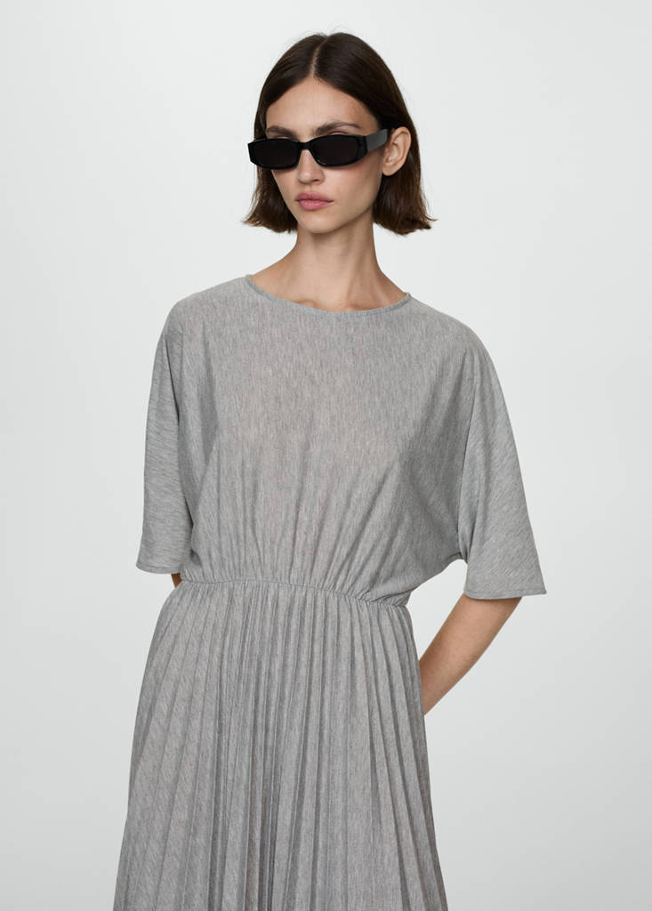 Fluid fabric. A-line design. Long design. Pleated design. Round neck. Short sleeves. Elastic waistband