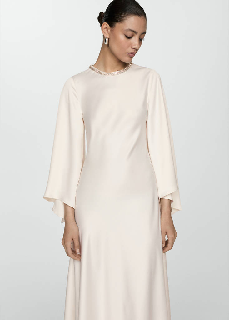Flared-sleeve satin dressInitial price struck through [US$ 149.99 ]US$ 149.99Current price [US$ 104.99 ]US$ 104.99-30%Select a colourOff WhiteThe model is wearing size 4 (EUR S) and is 5'11" tall.Select your size2 (EUR XS)Not available. I want it!4 (EUR S)Not available. I want it!6 (EUR M)Not available. I want it!8 (EUR L)Not available. I want it!10 (EUR XL)Not available. I want it!DimensionsNotify meSatin weave. Long design. A-line design. Round neck. Long flared sleeve. Invisible back zip fastening. Beaded detailDetails, composition and careStore availability