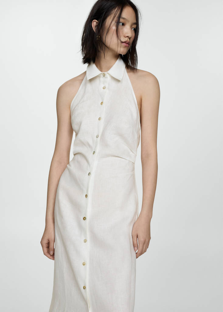 100% linen fabric. Straight design. Midi design. Shirt collar. Halter neck. Open back. Sleeveless. Selection Collection. Front button closure