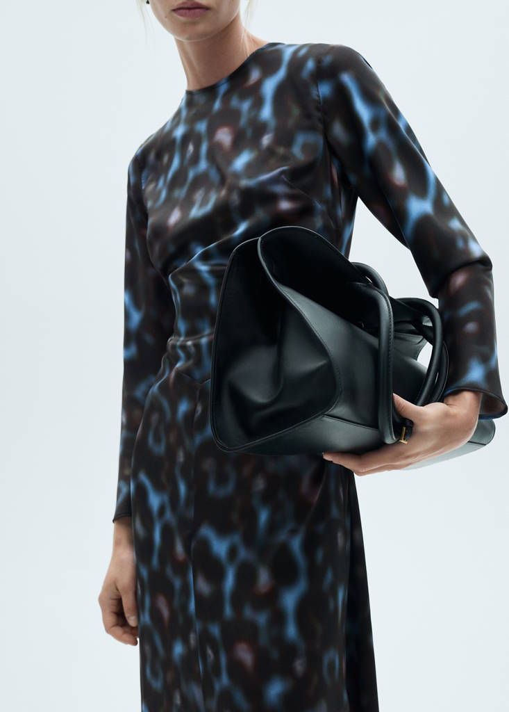 Satin weave. Fluid fabric. Printed design. Midi design. A-line design. Round neck. Long flared sleeve. Invisible back zip fastening