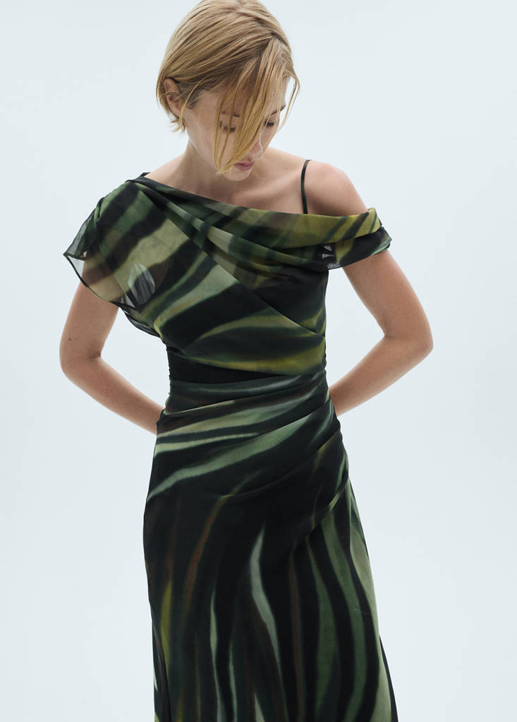 Fluid fabric. A-line design. Long design. Printed design. Off-shoulder design. Asymmetric neckline. Short sleeves. Invisible lateral zipper fastening. Inner lining