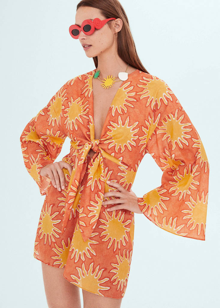 100% cotton fabric. Straight design. Short design. Sun print. V-neck. Long flared sleeve. Unclosed. Knot detail. Festival Season