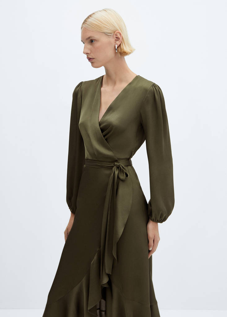 Fluid fabric. Satin finish. Midi design. Crossed design. A-line design. V-neck. Long sleeves with elastic cuffs. Ribbon at the waist with bow. Ruffle hem. Available Plus. Office looks
