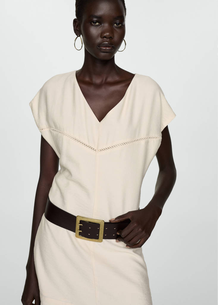 A-line design. Short design. V-neck. Short sleeves. Invisible back zip fastening. Embroidered detail