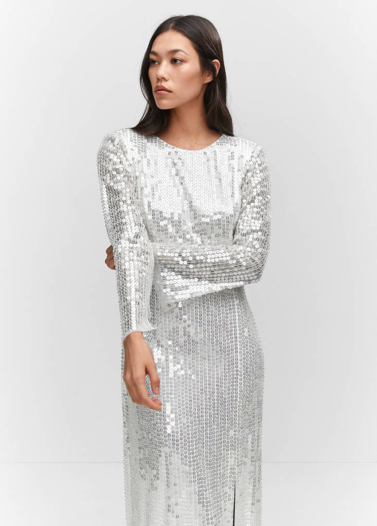 Decorated with sequins. Long design. Round neck. Long sleeves. Backless. Button closure at the back. Side slit. Party, ceremony, and communion collection. Fitted design