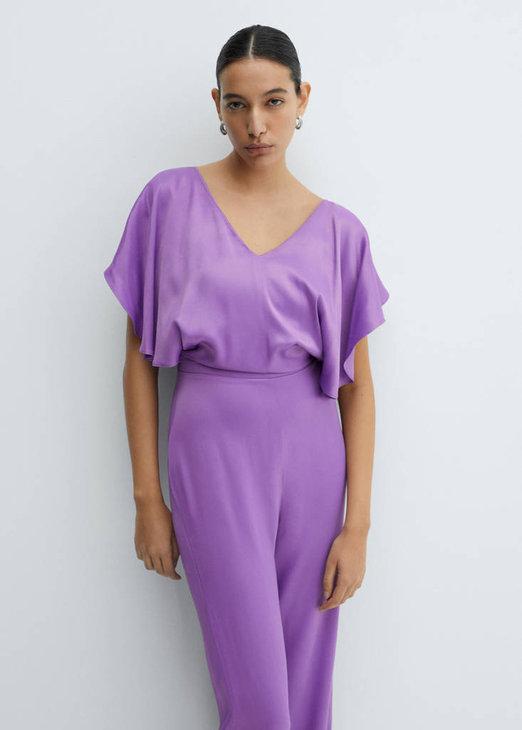 Fluid fabric. Satin weave. Long design. Straight design. V-neckline. Short sleeve with ruffle. Ribbon at the waist with bow. Party, ceremony, and communion collection. This garment is part of our event collection, designed to make you the perfect guest at any party, wedding, or ceremony.