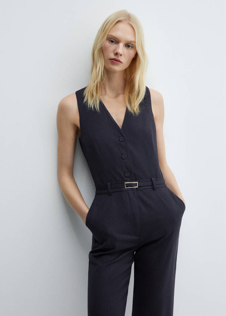 Long design. Straight design. Pinstripe pattern. V-neckline. Sleeveless. Wide straps. Belt loops. Two side pockets. Two welt pockets at the back. Front zipper closure. Inner lining. Front button closure