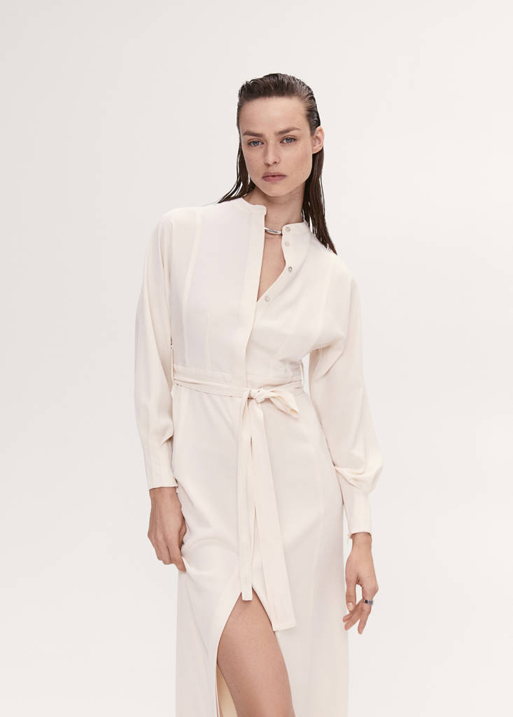 Selection Collection. Flowy fabric. Shirt-style. Long design. Straight design. Stand-up collar. Long sleeves with zipped cuff. Front button closure. Decorative seams. Lace fastening. Front slit. Inner lining