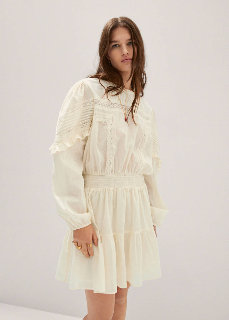 100% cotton fabric. Evasé design. Short design. Rounded neck. Long puffed sleeves. Elastic cuffs. Elasticated waist. Hem with ruffle. Embroidered details