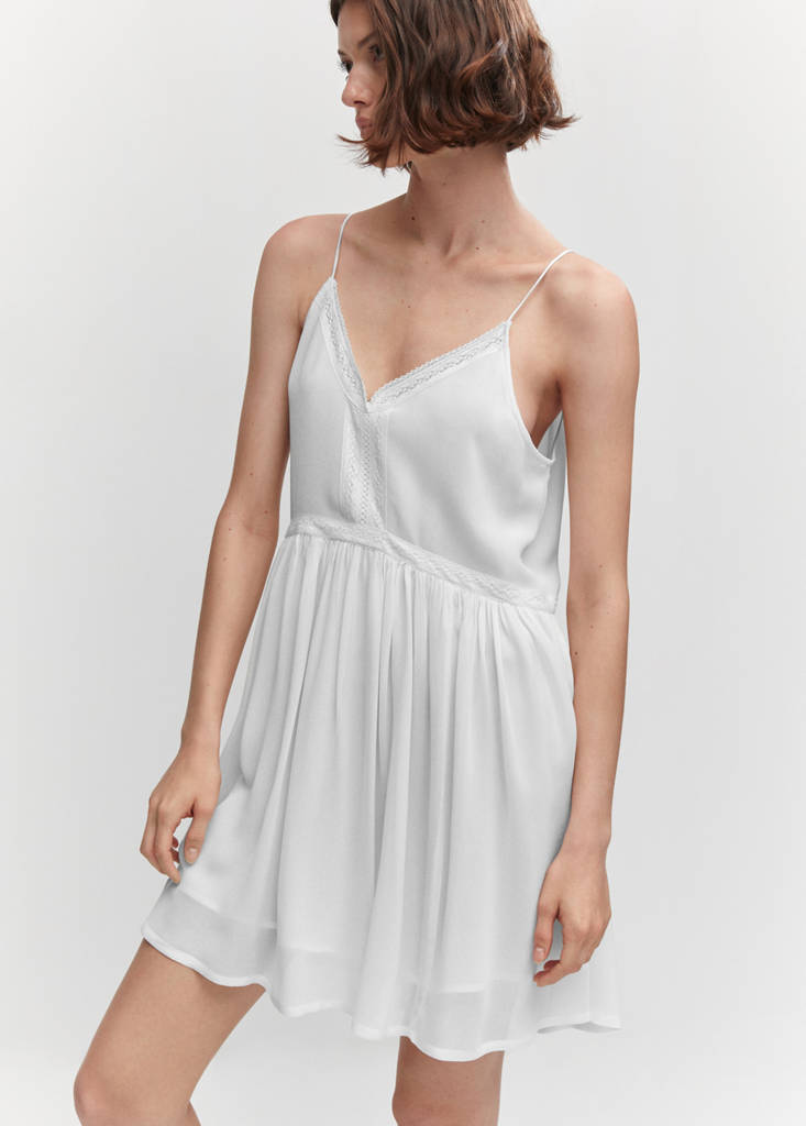 Fluid fabric. Semi-transparent fabric. Straight design. Short design. Semi-transparent design. V-neck. Thin straps. Embroidered details. Inner lining