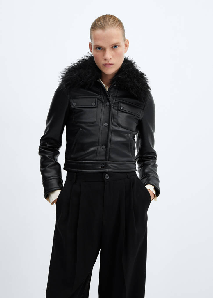 Leather effect. Quilted design. Short design. Shirt collar. Faux fur removable neck. Long sleeves. Two side pockets. Two-buttoned flap chest pockets. Inner lining. Front button closure