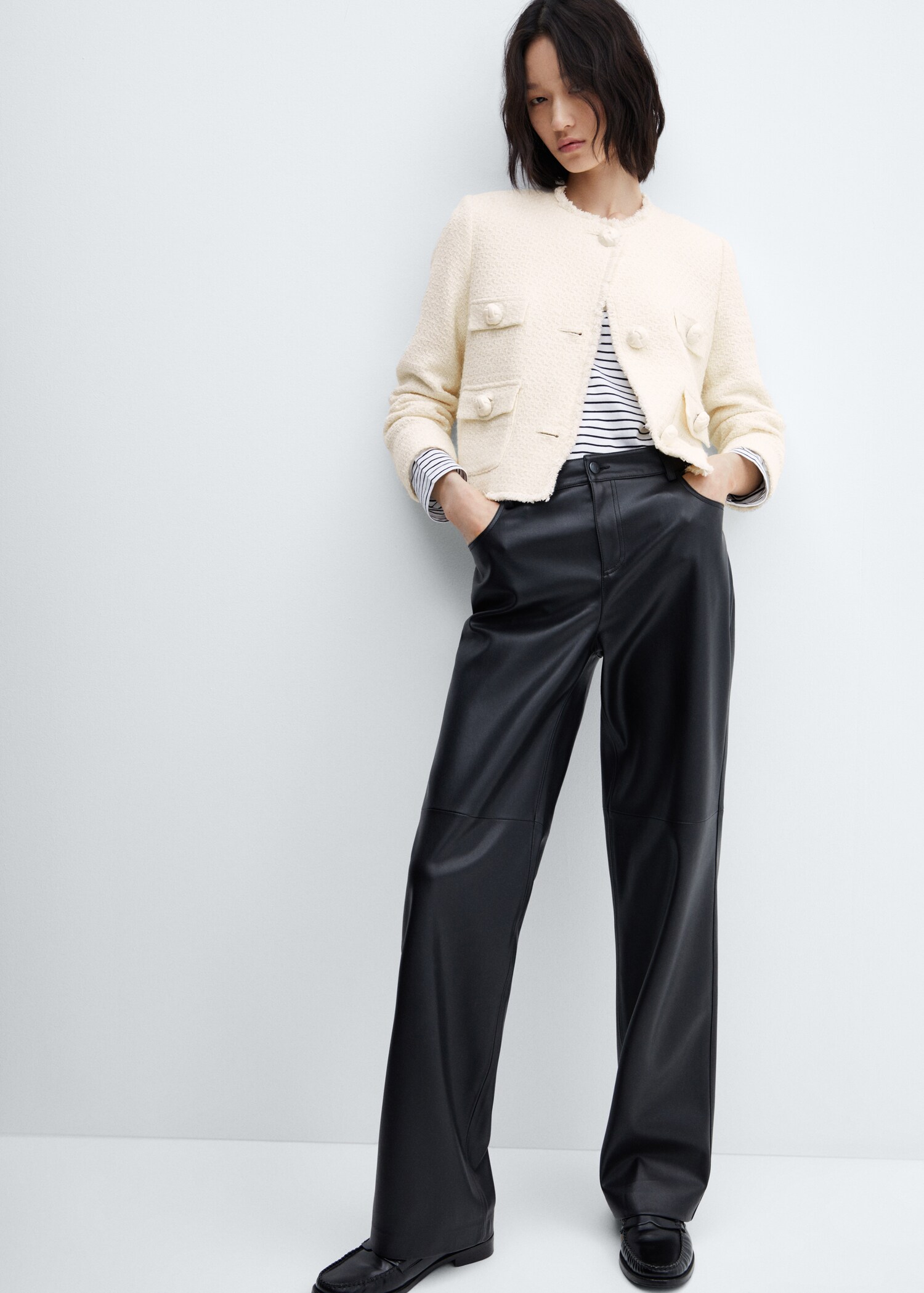 Tweed fabric. Cotton-blend fabric. Straight design. Short design. Rounded neck. Long sleeve. Four patch pockets on the front. Button fastening on the front section. Metallic buttons. Decorative buttons. Frayed finish. Inner lining. Plus Size Available. Party and events collection. Office looks.