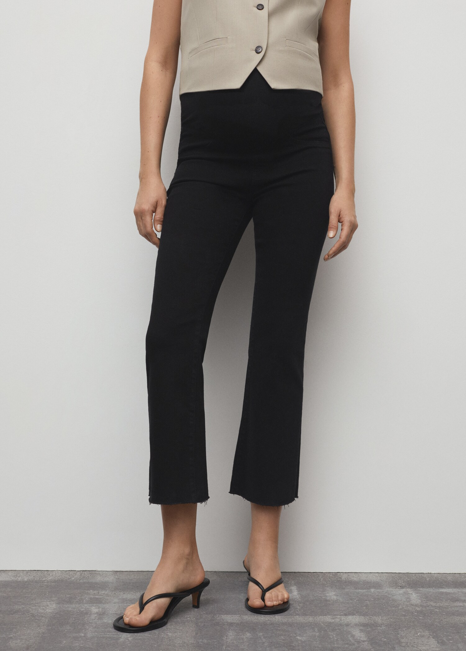 Denim-style cotton fabric. Bell design. Flare design. Crop design. Low waist. Elastic waistband. Soft elastic at front side waistband for added comfort and support the growing bump. Without waistband. No closure. Inseam 26.77 in. We recommend you buy your usual size. Provides comfort and freedom of movement. Maternity. Flared design.