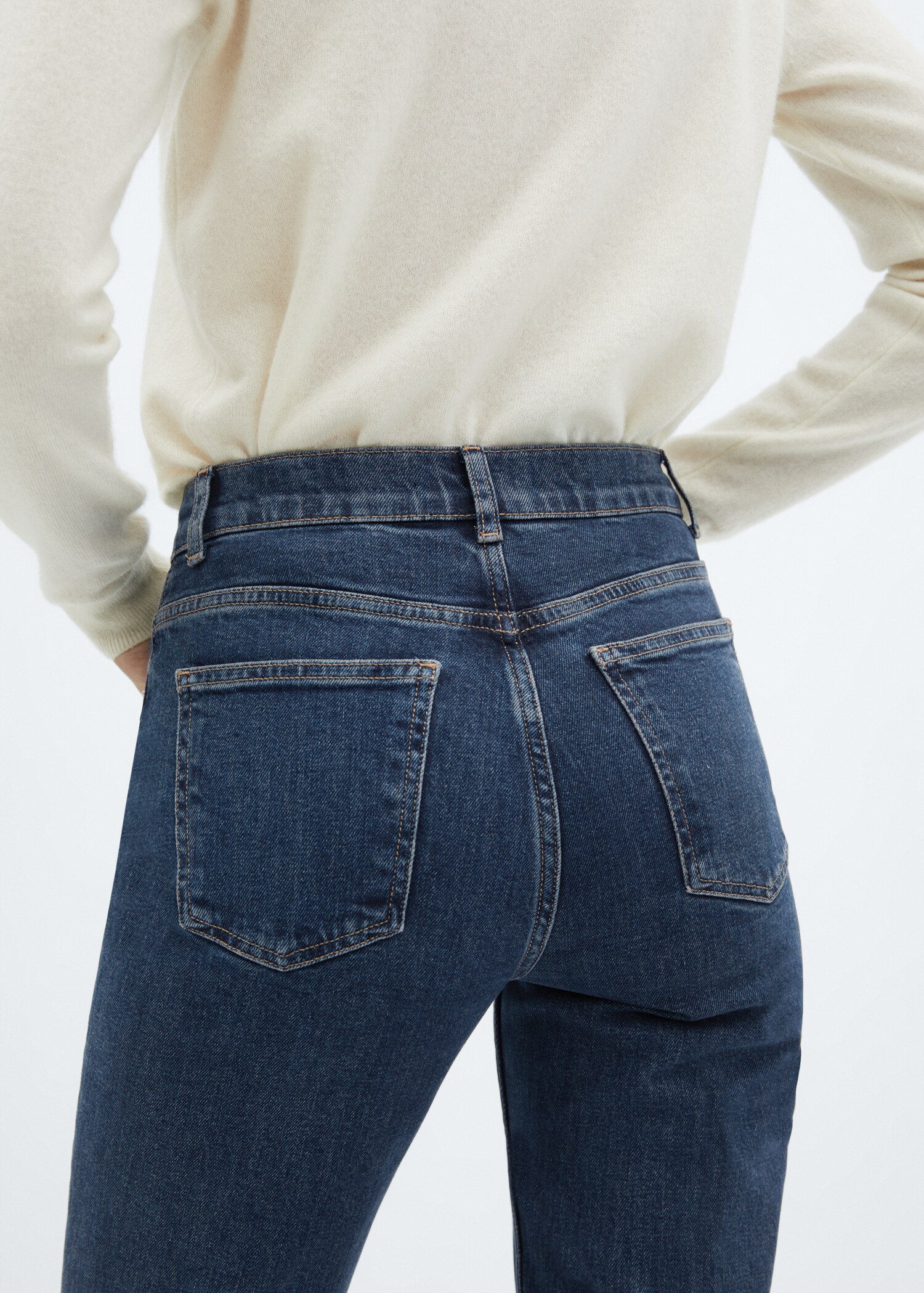 Cotton denim fabric. Flared design. Long design. Mid-rise. Zip and button closure. Five pockets. Belt loops. Inseam 35 in. Full length. Washing may vary.